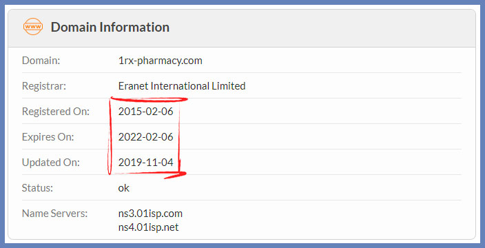 The pharmacy’s domain was first registered on 6th February 2015 and will continue its operation till 6th February 2022. This means the pharmacy lasted for over five years and still has around 14 months its lifespan. This is contrary to their claim of being in this business since 2010 and hence, you need to be cautious while using the website.