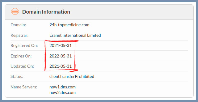 The domain of this e-commerce drugstore was first registered on the 31st of May 2021 which is the only time so far that this domain has been updated. The expiration date was set a year away at the time of registration, to the 31st of May 2022.