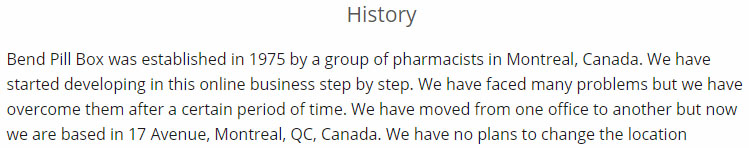 They also say that Bend Pill Box was first established in 1975 by pharmacists in Montreal, Canada. Why would Canadian pharmacists create a store in a different country? This doesn’t make any sense.