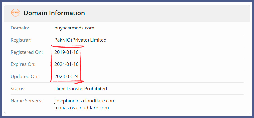 The first step in our review of the pharmacy website is to evaluate the domain information of the website. According to whois.com, the domain Buybestmeds.com was registered in 2019/01/16 under PakNIC (Private) Limited. This means the pharmacy website was registered 4 years ago and still counting. Also, the design of the website looks familiar and popular.