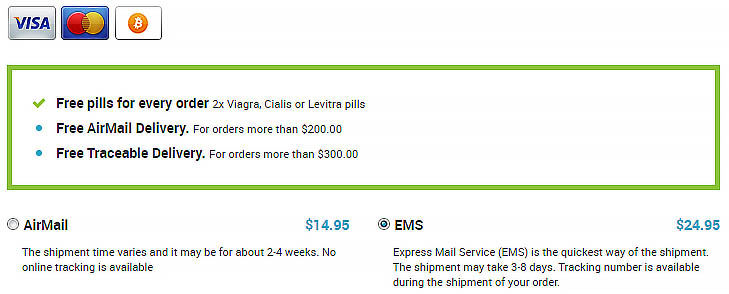 The pharmacy claims to offer safe and secure payment options via: Visa, MasterCard, Bitcoin