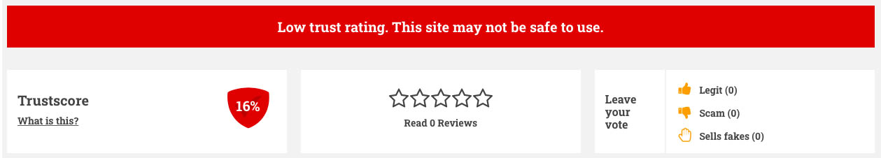 The pharmacy has a low trust rating of 16% on Scamadviser thanks to the several critical bugs and security glitches on the website.