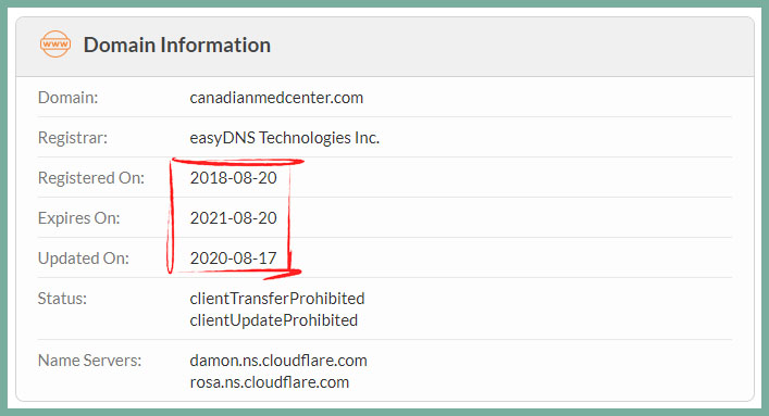 Looking at the domain name records for CanadianMedCenter.com we can see they have been registered for a couple of years. This isn’t a really long time, though it is longer than many online drugstores we see.
