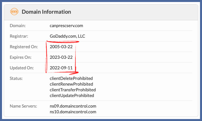 - Canprescserv.com is registered until March 22nd, 2023, indicating that they have intentions for the future.