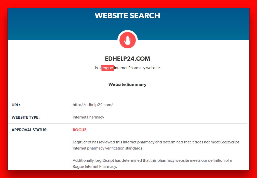 Judging by our findings, we can confidently state that edhelp24.com is a Scam. The owner of the pharmacy is unknown while the drugs on offer are suspect.