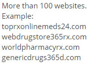 This section of genericdrugs365d.com reviews reveals that the domain is linked with illegal affiliate programs and it has more than a hundred of mirror websites with illegitimate and unclear registration details. Taking this into consideration, this online pharmacy can be flagged as a Rogue Pharmacy.