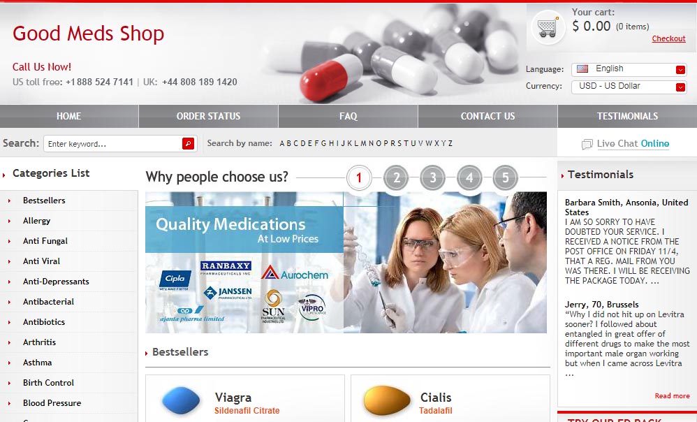 Goodmedsshop.com is an online pharmacy that claims to have amazingly low prices’. There is no mention on the drugstore website about where it is based, however, they do have the United Kingdom and United States phone numbers listed in the header of the website with other ways to get in contact being to use the live chat feature on the website as well as the built-in a contact form. Additionally, you are able to customize the language and currency you are using on the website from two pre-selected lists. Despite all the claims made by this pharmaceutical website little is known about it and in this article, we are going to be present through research where we explore all the claims made.