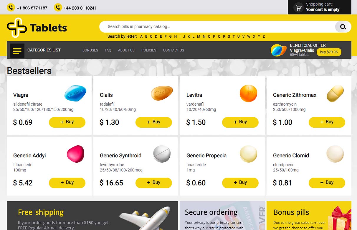 Hundreds of products are available for sale at this pharmaceutical e-commerce store with the majority of those products being generic. Bonus pills are promised with every and also a secure 256-bit order portal is also promised to all customers for extra security.