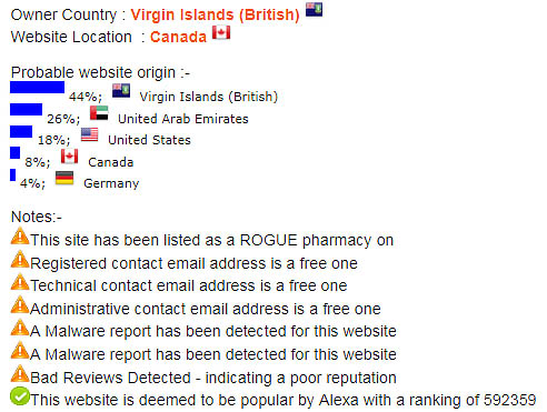 The long lifespan of the website is a good indication that the pharmacy is run by a genuine company. However, we discovered that there’s more to this pharmacy than what meets the eye. Firstly, the website appears to be based in Canada while the owner is located in the Virgin Islands. What is more alarming is that the provided phone number originates from the United Arab Emirates.