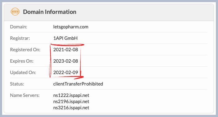 Letsgopharm.com domain was registered and last updated on February 8th, 2021. Its expected date of expiration is on the same date in 2023. Although the domain’s registrant name wasn’t provided, the contact information below was provided: