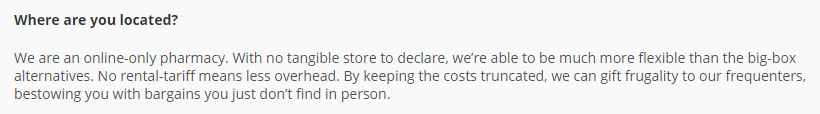 Instead, they use this question as an opportunity to promote how cheap their products are and why you should purchase from them. They cannot be an online-only pharmacy as they claim, the people operating the store don’t live in a server, they are located somewhere but they don’t want to let you in on the secret.