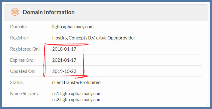 This store hasn’t been doing business online for long. We can see this thanks to a look in the domain name records. The site address was registered in 2018 which makes this drugstore more likely to be a Scam than somewhere you would want to place your trust.