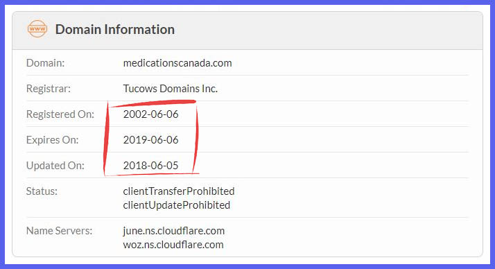 Let’s now quickly validate the domain details of this internet pharmacy. In order to verify these details, we have taken the reference of whois.com where we have found that the domain has been originally registered on 2002-06-06. From the domain registration date, it implies that the platform is running their business since 2002. The domain will be expired on 2019-06-06. Nevertheless, it’s expected that the domain expiry date will be extended further.