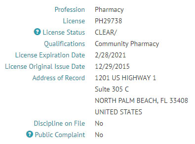 On the same page, they provide some information about their Florida pharmacy license. A check with the Florida Board of Pharmacy indicates that they are correctly licensed as they claim.
