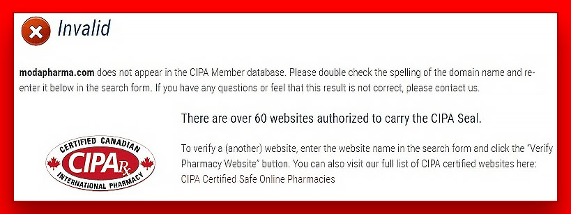 A search on CIPA.com reveals similar results. The pharmacy is not authorized to carry the CIPA seal as they do not appear in their database. This means that some or all of the drugs that this pharmacy offers for sale have not been certified as safe for human use.