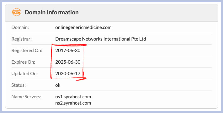 The domain of this drugstore platform was first registered on June 30, 2017, which wasn’t long ago. Looking at public databases, it also seems as if the domain’s ownership was updated recently on June 17, 2020. Also, during this specific time, the expiration date was set to June 30, 2025.