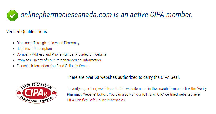 The pharmacy holds various certifications from regulatory bodies and agencies such as CIPA, and Pharmacy Checker. It has also been certified as safe by the International Pharmacy Association of British Columbia (IPABC).