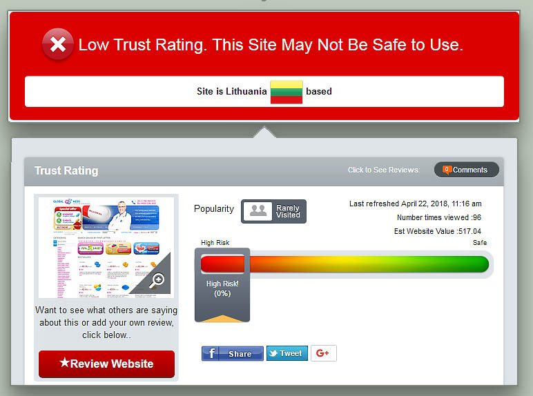 Besides the low ratings, this site is associated with hundreds of suspicious online drugstores. Most of these related sites bear the same features, including the same company name, website layout, business address and products. Additionally, a high number of these mirror websites have been flagged as rogue pharmacies by various regulatory agencies. This only means that this drugstore belongs to an illegal affiliate program that consists of well-organized scammers.