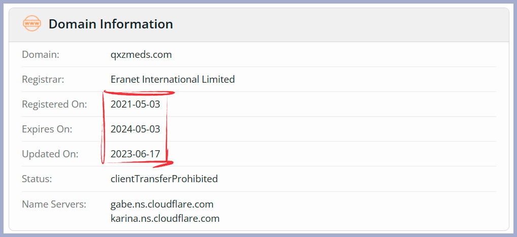 The domain qxzmeds.com was registered on May 3, 2021, meaning they are relatively new as compared to other pharmacies.