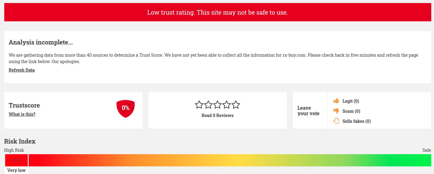 On Scamadviser, this online pharmacy has a trust score of 0% meaning that there is a strong Scam risk associated with it.