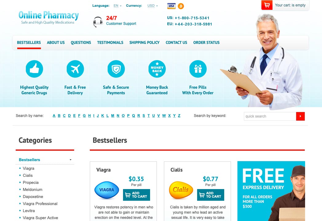 Two payment methods are currently supported on this e-commerce pharmacy, the first option available is Bitcoin which is a cryptocurrency that is anonymous but it comes with its own drawbacks since customers are not able to initiate a refund and instead need to hope that the seller refunds them. Secondly, customers can also pay using credit cards from leading companies in the field such as Visa, Mastercard, and Discover.