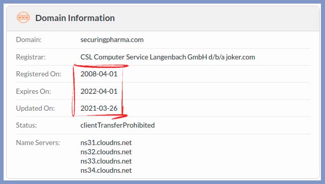 The domain of this online drugstore was registered for the first time on the 1st of April 2008 and then it was updated on the 26th of March 2021. At the time of writing this article, the expiration date of the domain was the 1st of April 2022.