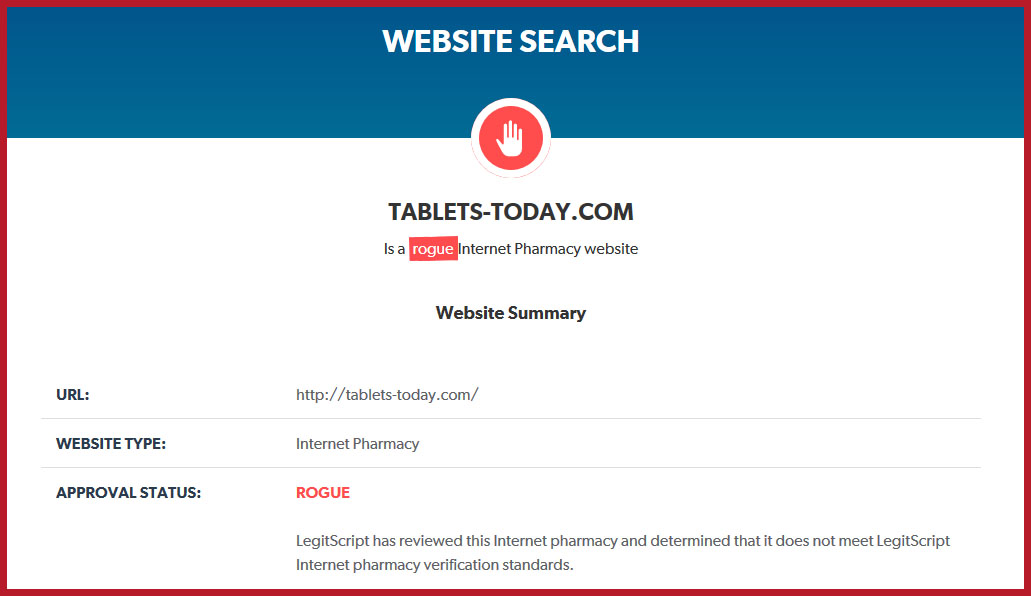 When we check with LegitScript they find that this is a problem too. They classify the store as a rogue business which is operating illegally for the locations it sells pills in.