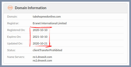 The domain of this online drugstore was first registered on the 10th of October 2020 and last updated on the 21st of October 2020. As of writing this article, the domain is right now set to expire on the 10th of October 2021.