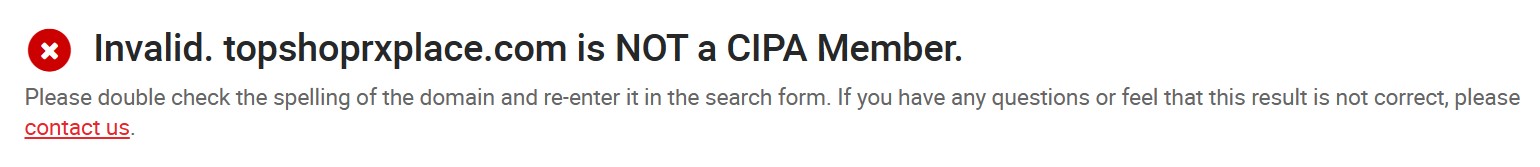 It’s always worthwhile to check an online pharmacy from the official regulatory sites to confirm its identity. Therefore, we checked it on CIPA.com and NABP.com. Although the website is based in the United States, it is not included in the approved pharmacies list of NABP. Furthermore, we checked CIPA’s registry for Topshoprxplace.com, and as suspected, they are not registered with CIPA either.