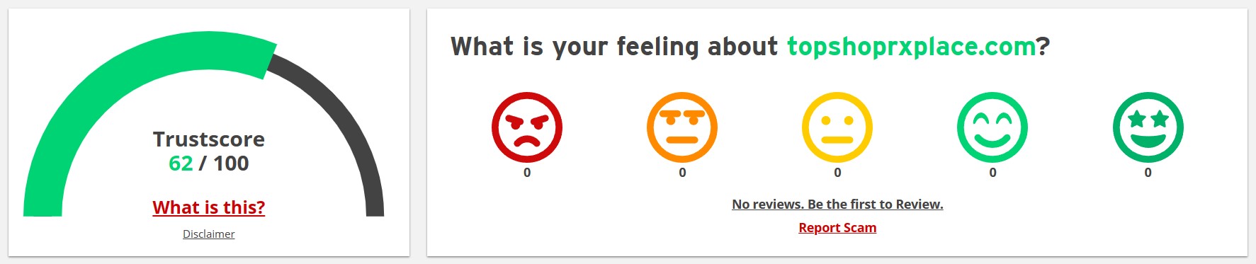 To confirm whether Topshoprxplace.com is a scam or legit, we checked it on Scamadviser.com. The results were surprising as Scamadvisor.com gave them a trust rating of 62 out of 100. However, we cannot rely solely on the rating of Scamadviser and we need further research to deem a pharmacy as a scam or legit.