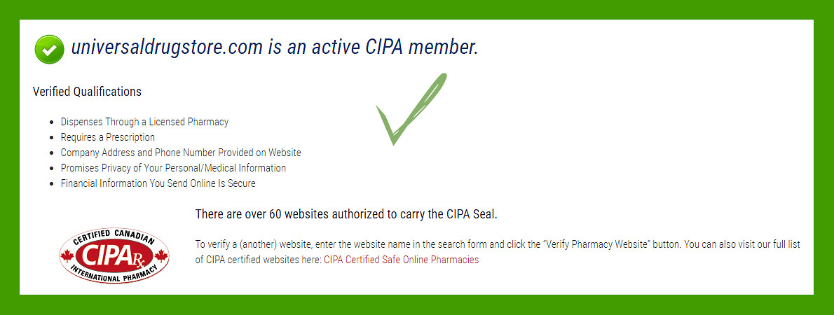 There are different standards of legal regulation around the world. This pharmacy is based in Canada where the main regulation comes from CIPA (the Canadian International Pharmacy Association). A seal from CIPA is displayed prominently on the home page of this store. When we check the CIPA database it confirms the correct use of this seal and their membership to the association.